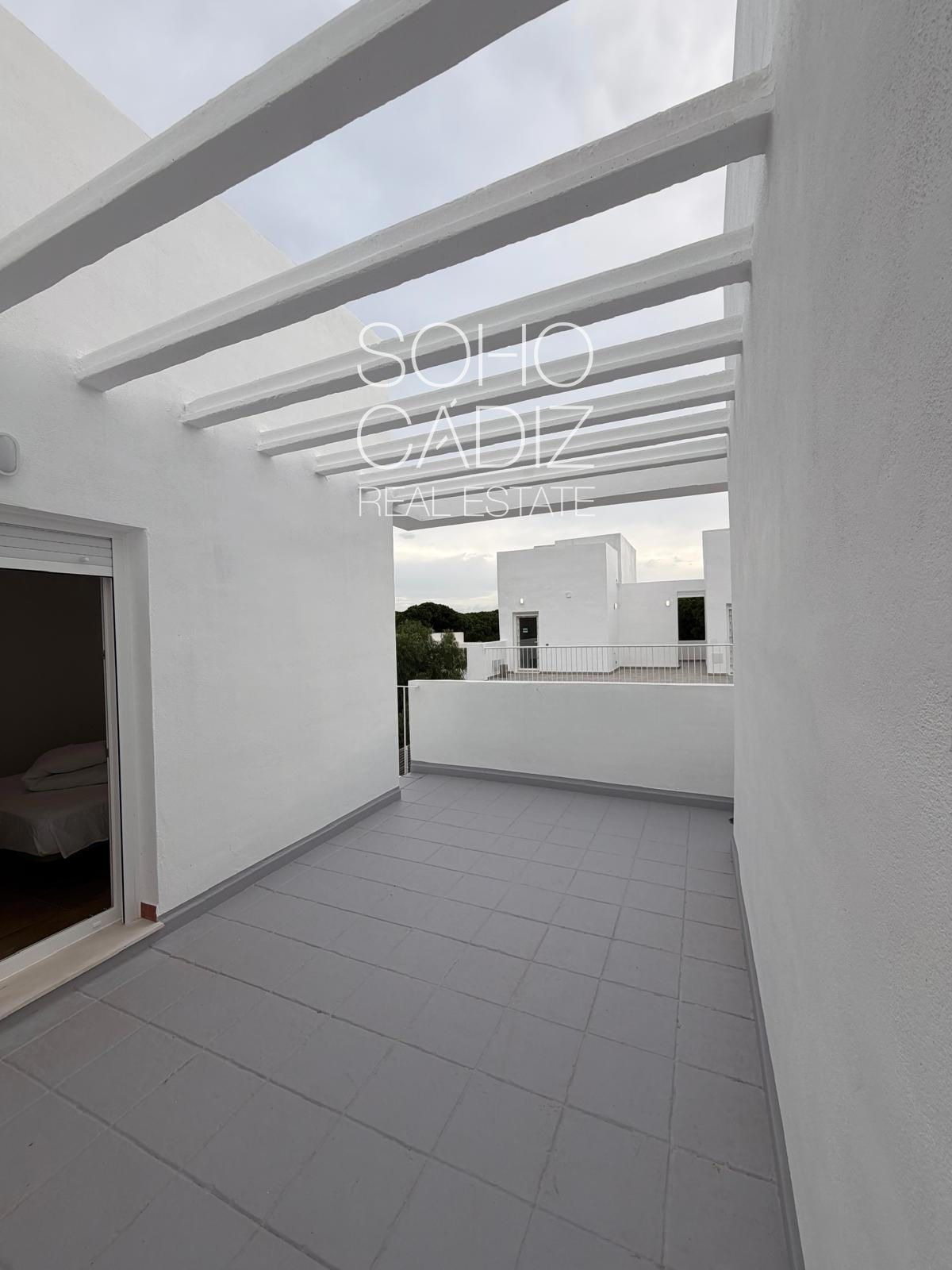 HOUSING WITHIN A TOURIST COMPLEX Ready to move in, furnished kitchen, parking, green areas, and communal pool. Quality features: walls made of double hollow brick, white lacquered wooden doors, double-glazed windows with thickness 6/64+4, blackout blinds, porcelain stoneware flooring, perlite walls with anti-mold paint, water supply from the municipal network, electricity and telephone supply, waste collection. If you want more information, please contact us.Three-story house, on the ground floor there is a rear porch that leads into the house; we enter the kitchen, the living room, and there is a small terrace. We go up to the first floor where we find two bedrooms and a complete bathroom. On that same floor, there is a 17 m2 terrace. We go up to the last floor, which has a solarium of 11 m2 and a private pool of 8.5 m2. Not included in the price are taxes, purchase-sale expenses (notary...), or agency commission.